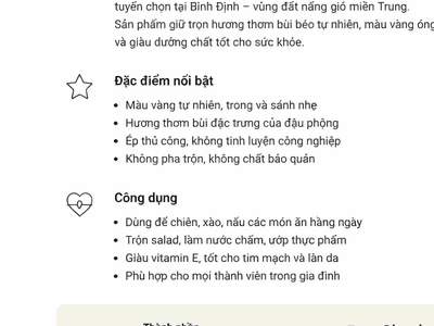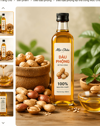 Dầu đậu phộng Mộc Châu được ép thủ công từ hạt đậu phộng phơi khô tự nhiên, giữ trọn hương vị và chất dinh dưỡng từ thiên nhiên. Không hóa chất, không chất bảo quản. Chai 1 lít phù hợp cho gia đình nhỏ dùng 2-3 tuần.